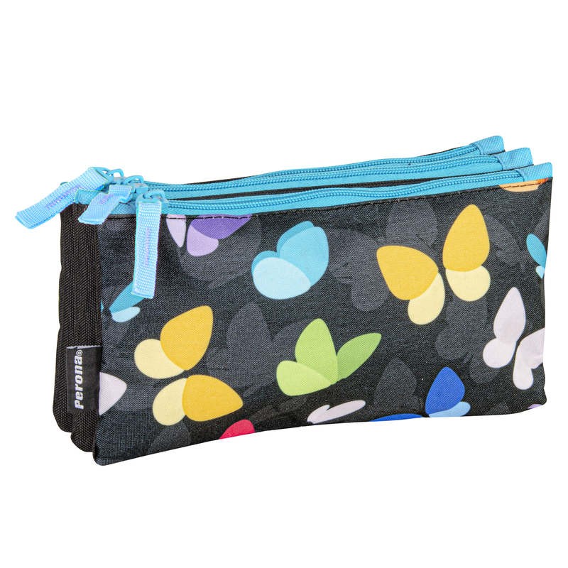 Inclui: 1 estojo preto com design especial Campro Flapping com borboletas coloridas, três compartimentos separados por fechos de correr, cursores personalizados, fechos de correr de alta qualidade, forro interior e puxador de cursor.