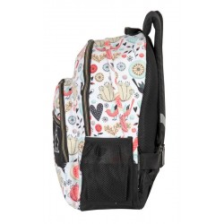Inclui: 1 mochila dupla branca com desenho de pássaros, corações e flores a cores, sistema adaptável a um carrinho oculto, logótipo bordado, alças reguláveis, respiráveis e acolchoadas, encosto duplo acolchoado, forro interior de proteção, fita refletora nas alças, base com reforço duplo para proteção, alça de PVC na parte superior, dois espaços com fechamento em zíper e bolso frontal com dois espaços, alças especiais e bolso lateral em tela para a garrafa.