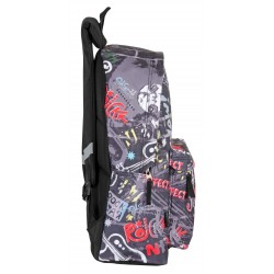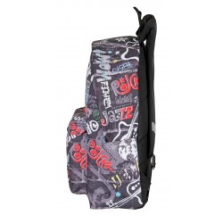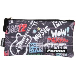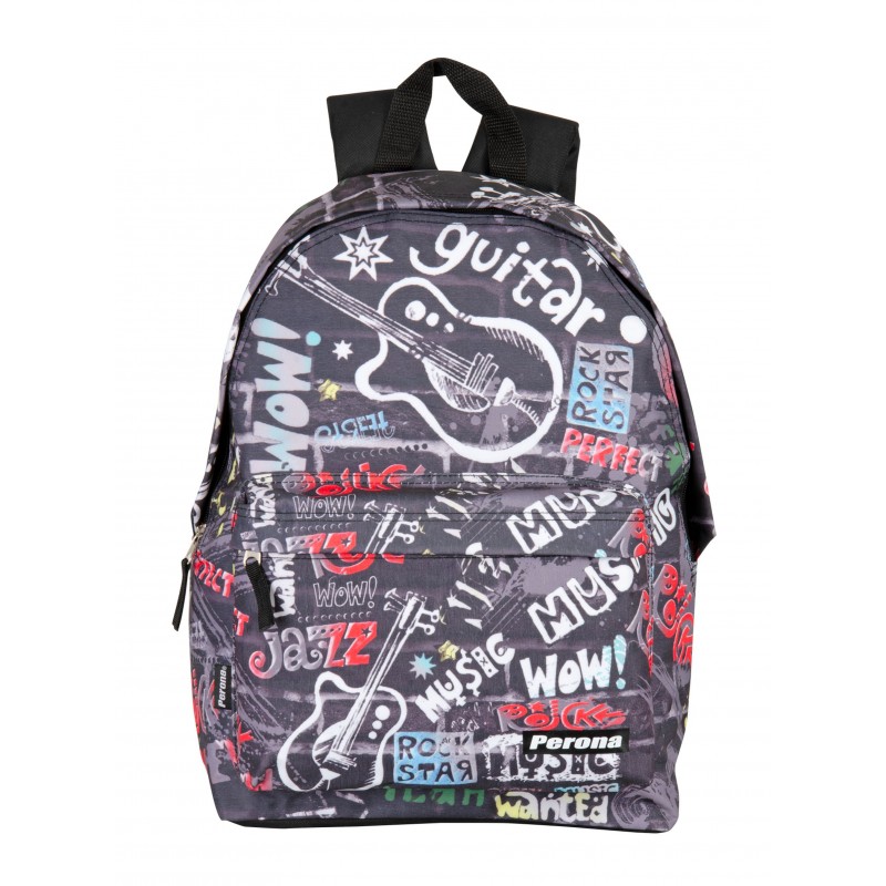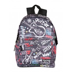 Inclui: 1 mochila júnior preta com desenhos musicais, compartimento principal com fecho de correr, bolso frontal com fecho de correr, alças acolchoadas e ajustáveis, costas acolchoadas, sistema para a adaptar a trolleys de mochila, alça superior e faixas refletoras e 1 estojo plano com fechamento por zíper e alça deslizante.