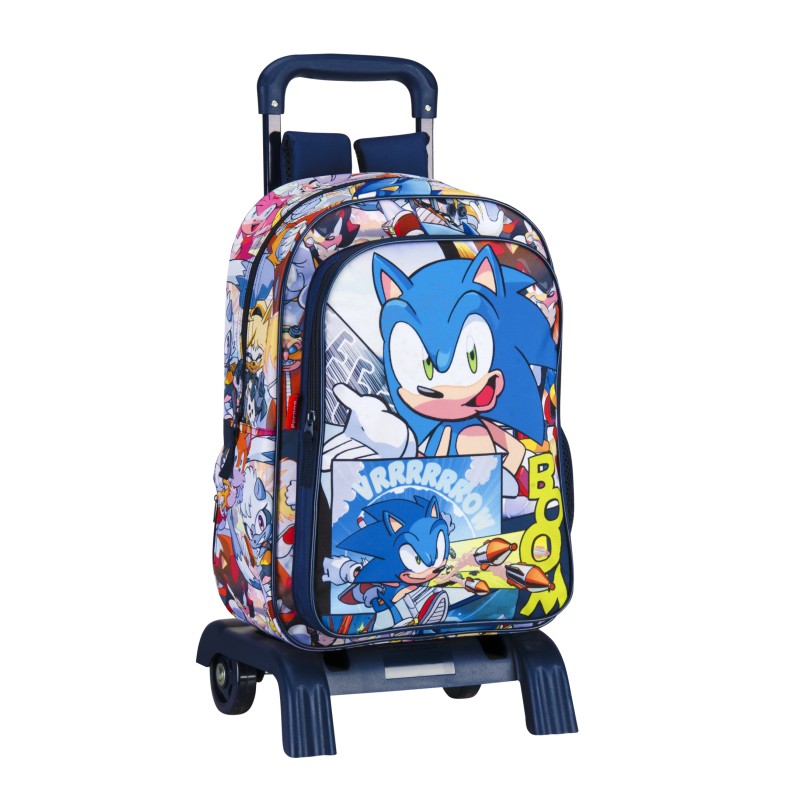 Adquire esta incrível mochila júnior de grande tamanho e com características extremamente úteis para uma nova e emocionante etapa escolar. Uma mochila com carrinho de máxima qualidade e design especial do Sonic sobre um fundo de estilo cómico, onde se podem ver vários dos protagonistas da série animada.