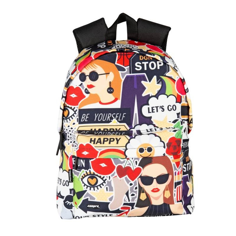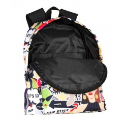 Inclui: 1 mochila júnior com estilo comic a cores, compartimento principal com fecho de correr, bolso frontal com fecho de correr, alças acolchoadas e ajustáveis, costas acolchoadas, sistema para adaptá-la a trolleys de mochila, alça superior e faixas refletoras.